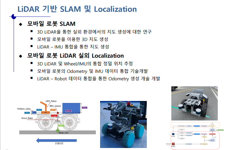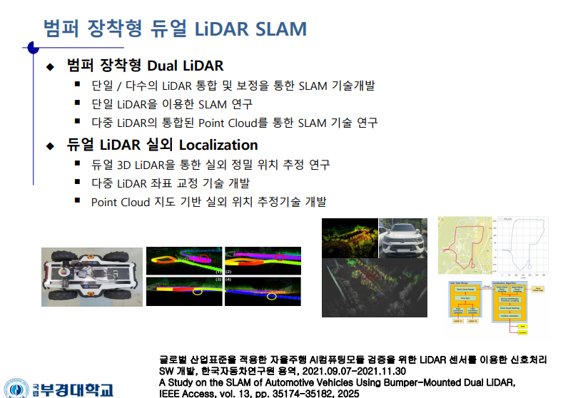 Research Project 고중량물 이송 자율이동체 시험평가센터 기반구축사업 (24.08.01-28.12.31) 다중대차 견인형 자율주행 물류로봇 기술 개발 (23.04-26.12) 자율주행 AI컴퓨팅모듈 검증을 위한 LiDAR 센서를 이용한 신호처리 SW 개발 (21.09-21.11) Research Topic