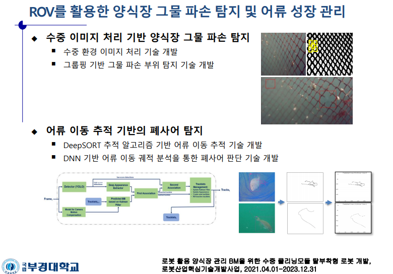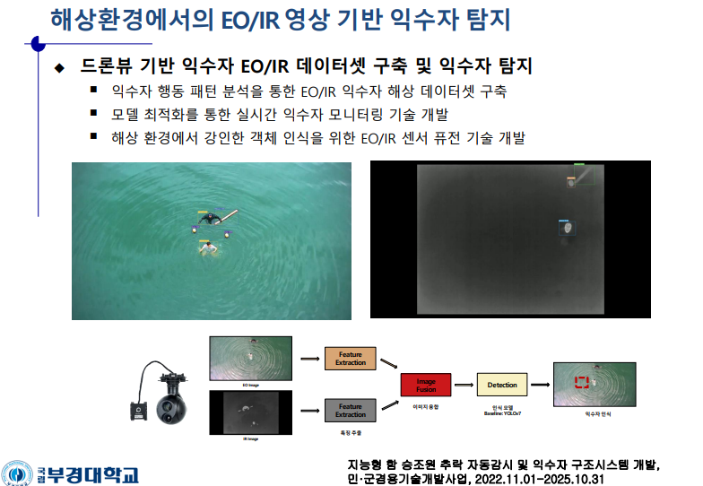 Research Project 지능형 함 승조원 추락 자동감시 및 익수자 구조시스템 개발 (22.11-25.10) 로봇 활용 양식장 관리 BM을 위한 수중 클리닝모듈 탈부착형 로봇 개발 (21.04-23.12) Ethernet 기반 심해용 원격 영상 제어 시스템 개발 (17.09-18.08) Research Topic